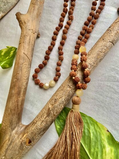 Nuestro Japamala BANGALORE está formado por cuentas de rudraksha de 7mm y cuentas de gemas naturales de 8mm. Anudadas en hilo torzal y borla con el mismo hilo.